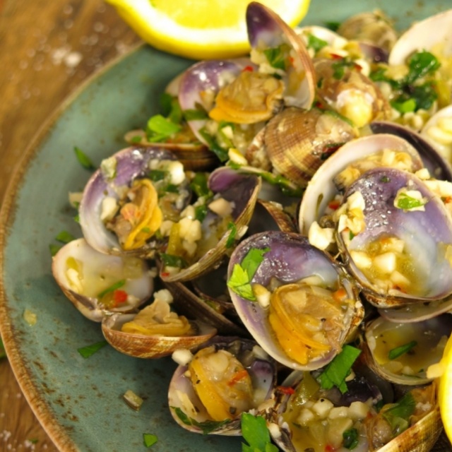 Dann Knoblauch, Schalotte, Pfeffer und Erbe Italiano hinzufügen und gut vermischen. Kurz backen (max. 2 Minuten), bis sich die Muscheln öffnen und sich die Feuchtigkeit löst. Mit Wein ablöschen und Petersilie hinzufügen. Noch eine Minute schmoren lassen.  Dann die Butter hinzufügen und die Muscheln gut schütteln, damit sich die Flüssigkeit und die Butter gut vermischen. Die Vongole mit einer kleinen Scheibe Zitrone servieren.