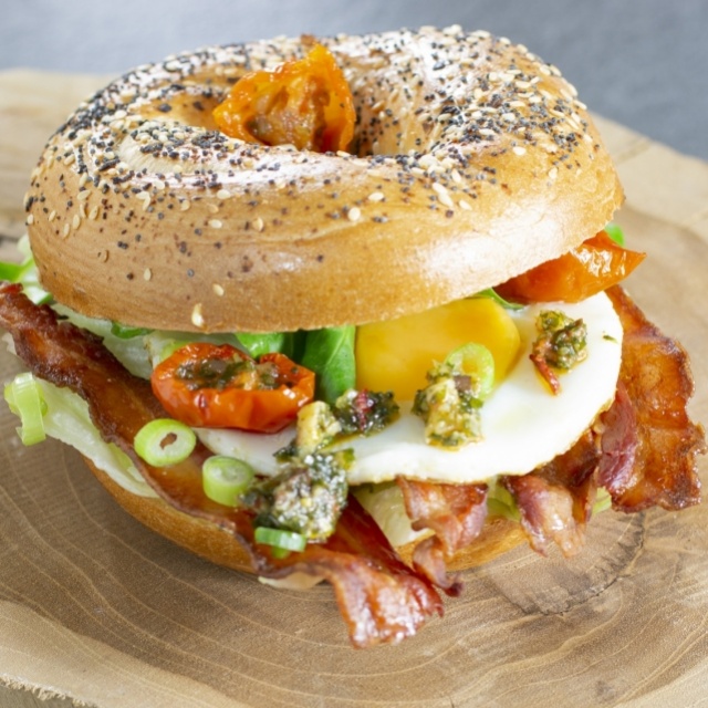Season the alioli with the mustard. Cut the bagels open and spread the mustard alioli mix on the cut edges. Arrange the iceberg lettuce, cherry tomatoes and streaky bacon on the bottom halves of the bagels. Place the fried eggs on top. Drizzle the chimichurri over them. Place the other half of the bagel on top.