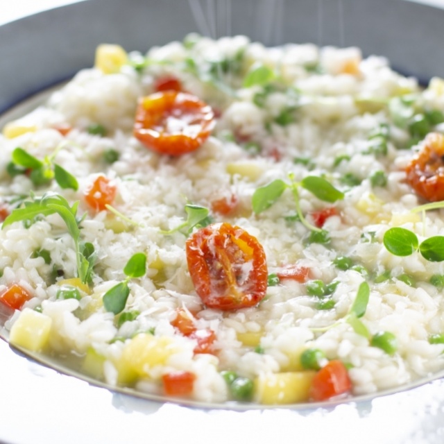 Blanch all the vegetables. Stew the freshly chopped shallot and garlic in the olive oil. Add the blanched vegetables. Season with Erbe Italiano, salt and pepper. Add the vegetables to the risotto.